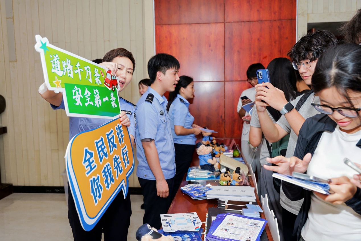 活動(dòng)正式開始前,學(xué)校禮堂外的互動(dòng)區(qū)早已人頭攢動(dòng)。禮堂大廳設(shè)置的禁毒、反詐、戶政、交通等多個(gè)宣傳展臺(tái)前圍滿了新生。