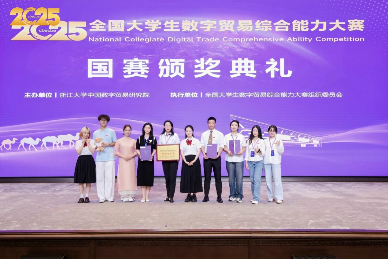 9月28日,第四屆全國大學生數字貿易綜合能力大賽全國總決賽頒獎典禮在浙江杭州舉行。我校經濟學院、國際教育學院組成的中外學生聯隊獲得絲路電商來華留學生賽道全國總冠軍(一等獎第一名),趙楠、陳雪琪老師獲“優秀指導老師”稱號。學校榮獲優秀組織獎。