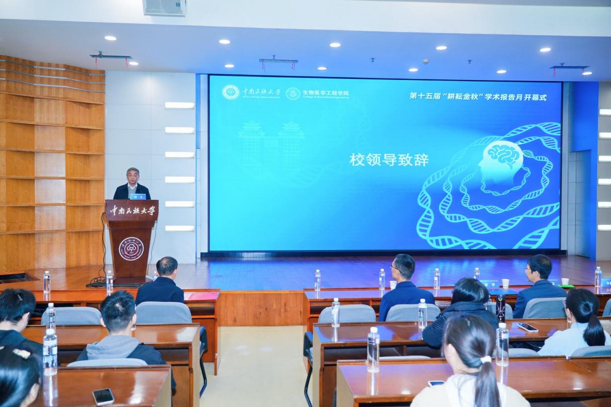 校黨委副書記、校長劉義出席開幕式并致辭。他指出,“耕耘金秋”學術報告月是學校推進醫工交叉、深化研究生培養、服務國家創新戰略的重要平臺。生物醫學工程作為多學科融合的前沿陣地,在服務“健康中國”建設中具有關鍵作用。他提出要堅守初心、強化學科根基,把握機遇、對接國家需求,重視青年、搭建成長階梯三點期望,鼓勵師生以醫工交叉融合為路徑,以服務人民群眾大健康事業為己任,在服務國家需求和科學探索的道路上刻苦鉆研、不斷攀登,努力實現更大價值。