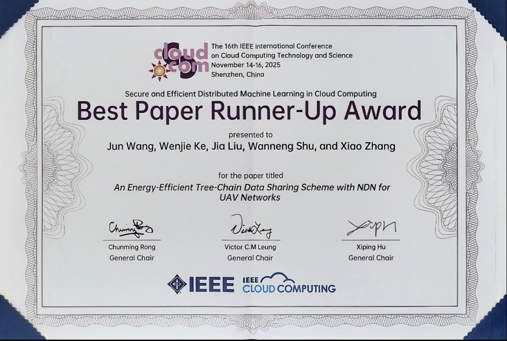 11月16日,從第十六屆IEEE云計算技術與科學國際會議(The 16th IEEE International Conference on Cloud Computing Technology and Science,簡稱IEEE CloudCom)獲悉,我校計算機學院(人工智能學院)碩士研究生柯文杰論文An Energy-Efficient Tree-Chain Data Sharing Scheme with NDN for UAV Networks在眾多優秀成果中脫穎而出,榮獲IEEE CloudCom 2025最佳論文亞軍獎。