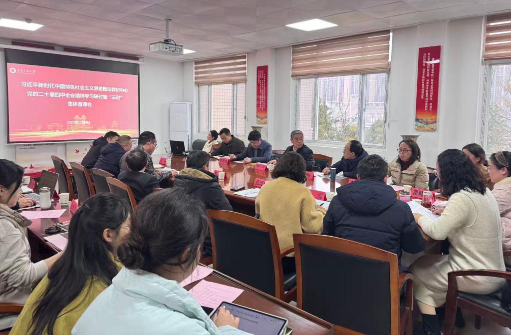 會上,馬克思主義學院院長黎海波匯報了學院學習貫徹黨的二十屆四中全會精神、推進思政課建設和開展教研活動情況。“習近平新時代中國特色社會主義思想概論”教研中心張濤華教授領學了習近平總書記《關于<中共中央關于制定國民經濟和社會發展第十五個五年規劃的建議>的說明》,易新濤教授以《把握時代脈搏 踐行使命擔當——深入學習貫徹黨的二十屆四中全會及“十五五”規劃建議精神》為題,對全會精神作了解讀。在集中研討環節,胡祥副教授、白雪博士、高海波博士分別以《堅持有效市場和有為政府相結合,加快構建社會主義市場經濟體制》《感悟“十五五”規劃建議里的民生溫度》《黨的二十屆四中全會精神融入“全過程人民民主”“社會主義現代化強國建設”》為題,就如何將全會精神融入教學進行交流分享。張玉蓉博士作了補充交流發言。