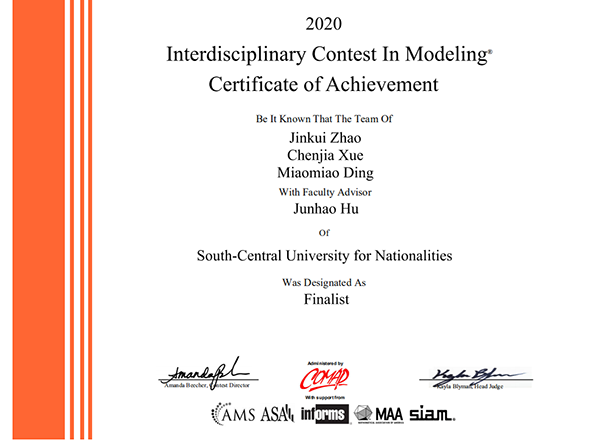 近日,2020美國大學生數學建模競賽(MCM)與交叉學科建模競賽(ICM)成績揭曉,由數統學院教師團隊指導的我校各院參賽學子喜獲佳績,包括特等獎提名(Finalist)1項、一等獎(Meritorious Winner)1項、二等獎(Honorable Mention)13項。相比往年,本次參賽在獲獎級別和獲獎數量上均取得新的突破。