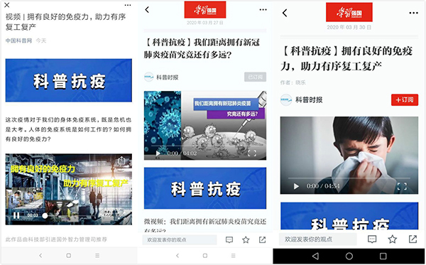 在被推薦的視頻《我們距離擁有新冠肺炎疫苗究竟還有多遠?》中,韓老師從疫苗的作用機理、技術路線、種類特點以及我國研發(fā)新冠病毒疫苗的進展等多個角度,以通俗易懂的文字和生動形象的畫面,幫助社會大眾更加科學地認識疫苗。另一部被推薦的視頻《擁有良好的免疫力 助力有序復工復產(chǎn)》則從人類免疫系統(tǒng)三大防線的作用方式、特點以及如何提高人體免疫力等方面,普及了免疫系統(tǒng)知識。這兩部科普視頻通過對疫苗研發(fā)進展和研制團隊、人體免疫系統(tǒng)對抗病毒過程的介紹,引導社會大眾更加堅定科學抗疫的信心。