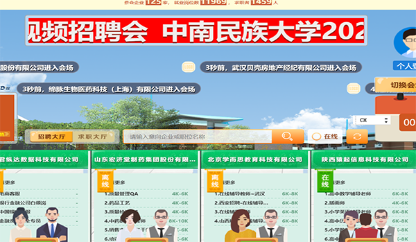 3月6日至12日,我校2020屆畢業生春季網絡視頻招聘會舉行。陜西鋼鐵集團有限公司、國藥集團中聯藥業有限公司、湖北單色文化傳播有限公司、武漢掌游科技有限公司、和君縱達數據科技有限公司、馬應龍藥業集團股份有限公司、湖北三寧化工股份有限公司等125家省內外知名單位參會,提供11969個崗位需求信息。