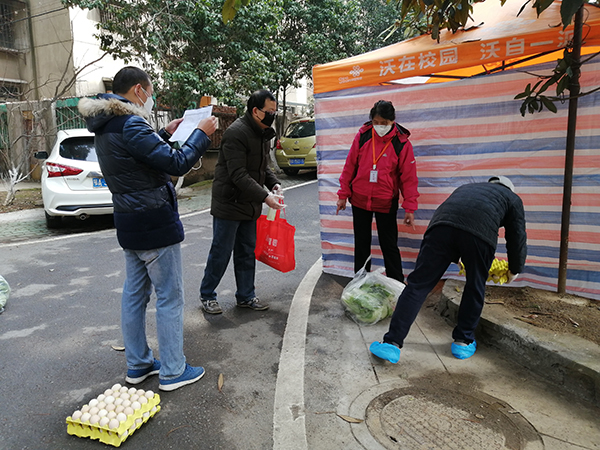 志愿者為樓棟住戶派送物資。黨委宣傳部供圖