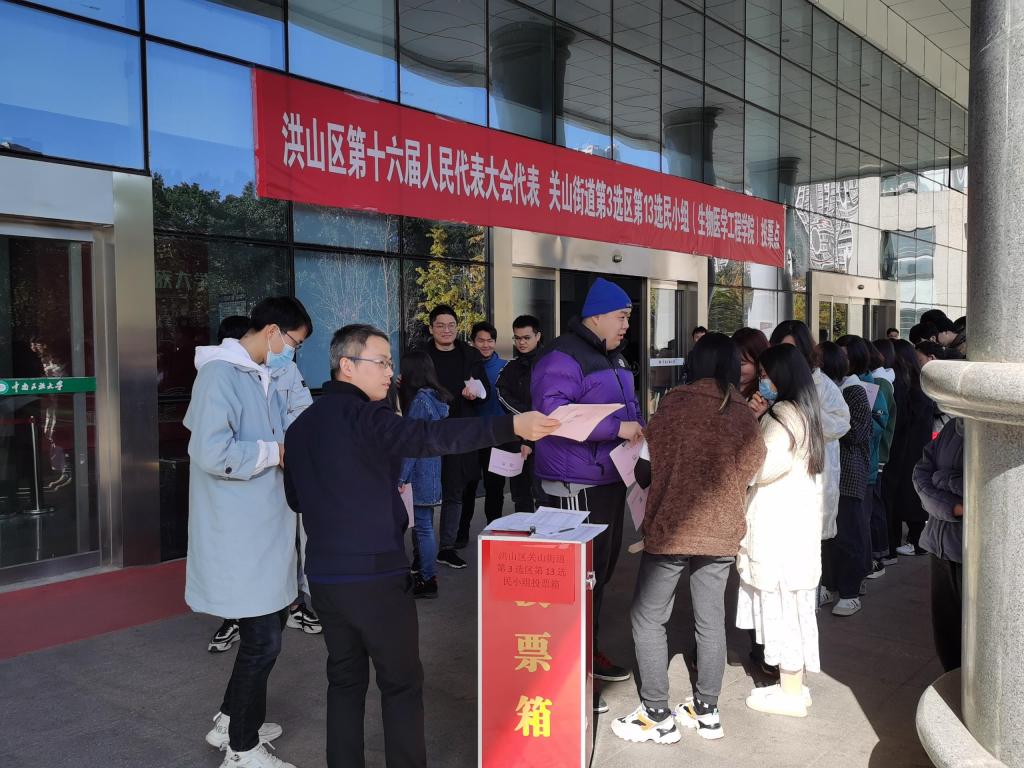 12月1日,我校作為武漢市洪山區關山街第3選區的牽頭單位,組織了本選區區級人大代表換屆選舉工作。根據《洪山區區級人民代表大會換屆選舉工作實施方案》及疫情防控要求,本選區設立1個中心會場,2個投票站及32個投票點,共計28500余名選民參加了投票。校黨委常委邊境、李金林、白江源、段超、楊勝才、杜冬云、韓葉盛、宋發軍、喬俊杰、蔡瓊作為本選區普通選民參加了中心會場的選舉大會。