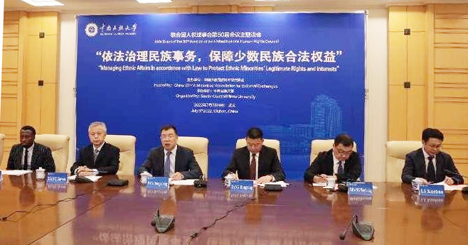 7月5日,聯合國人權理事會第50屆會議主題邊會“依法治理民族事務,保障少數民族合法權益”在我校學術交流中心舉行,來自中國、吉爾吉斯斯坦、英國、烏茲別克斯坦、老撾、新西蘭和盧旺達等7個國家的18名專家學者,以線上線下相結合的形式展開研討。會議由中國少數民族對外交流協會主辦,我校承辦。