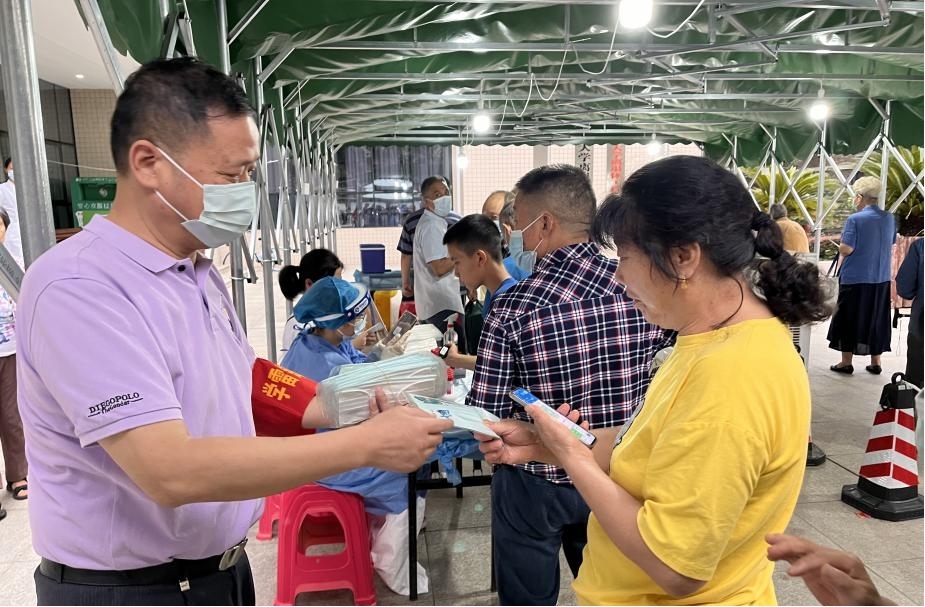 在核酸檢測現(xiàn)場,社區(qū)居民沿著標(biāo)志按順序排隊,有序等待核酸采樣。社區(qū)工作人員和下沉黨員在居民等待核酸檢測的間隙,為居民送上印有“廉”字的防疫口罩和印有社區(qū)廉潔宣傳二維碼的紙巾,居民用手機(jī)掃描二維碼即可學(xué)習(xí)清廉文化知識。