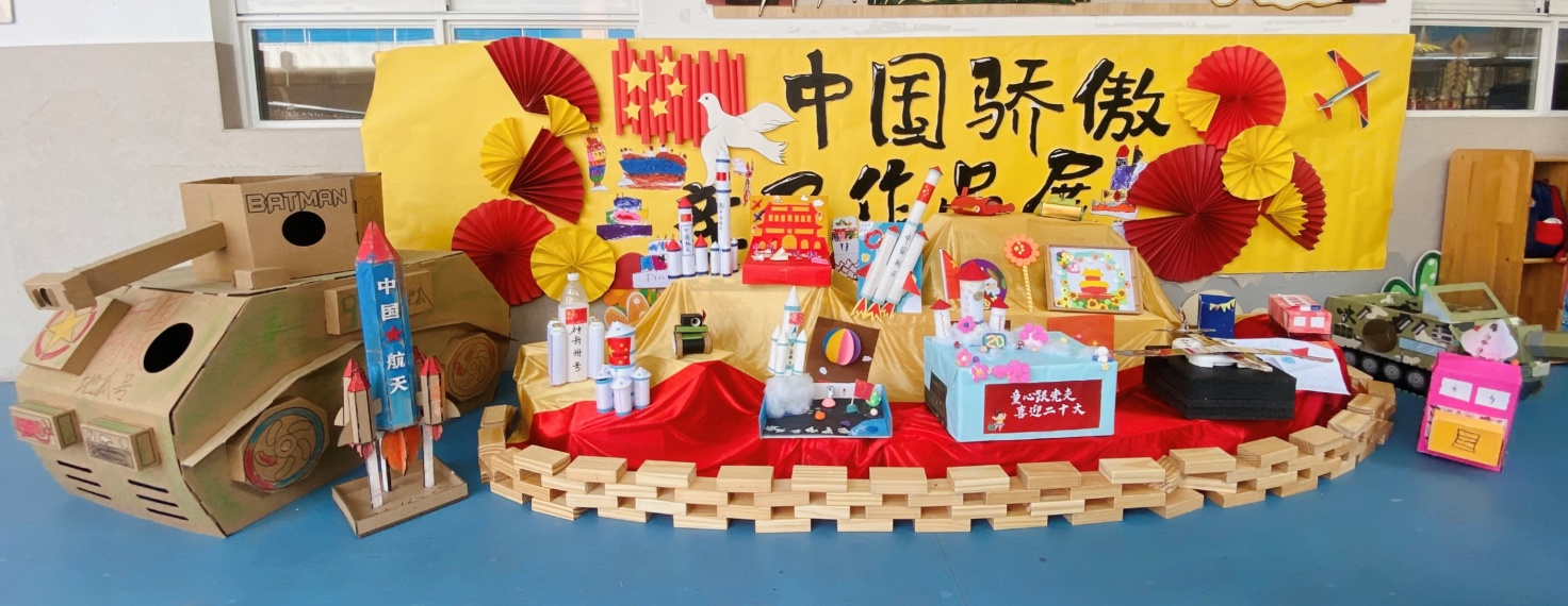 教室、功能室里也是琳瑯滿目、祝福滿滿。孩子們穿著各族服飾齊聚在活動區(qū),揮動著手中的紅旗。有的將小手蘸上醒目的紅色、黃色顏料,制作紅旗;有的用秋天的落葉貼中國地圖,讓中國大地變成一片綠洲;有的在中國地圖上畫上屬于我們中國人自己的科學故事;有的用超輕粘土制作北京天安門、升旗臺、多層生日蛋糕……
