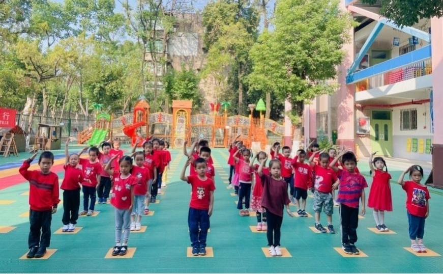 操場上,大班的小朋友身穿紅色的T恤,伴隨著動人的音樂旋律《精忠報國》《美麗中國》《萬疆》……一起歌唱,一起舞蹈,瞬間氣氛被點燃了。看,一曲《萬疆》結束時,畫面定格在美好的那一刻。一群天真爛漫的孩子,一雙雙熾熱的眼睛看向五星紅旗,舉起了小手向祖國致敬。