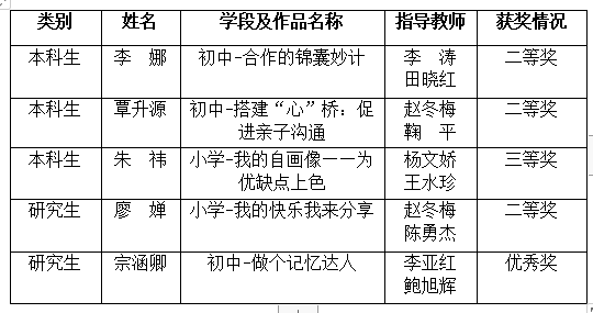 10月31日,湖北省大學生/研究生心理輔導課教學競賽落下帷幕,我校參賽的5名教育學院同學取得本科生組二等獎2項、三等獎1項,研究生組二等獎與優秀獎各1項的優異成績,展示了教育學院應用心理學省級一流專業建設的成果。