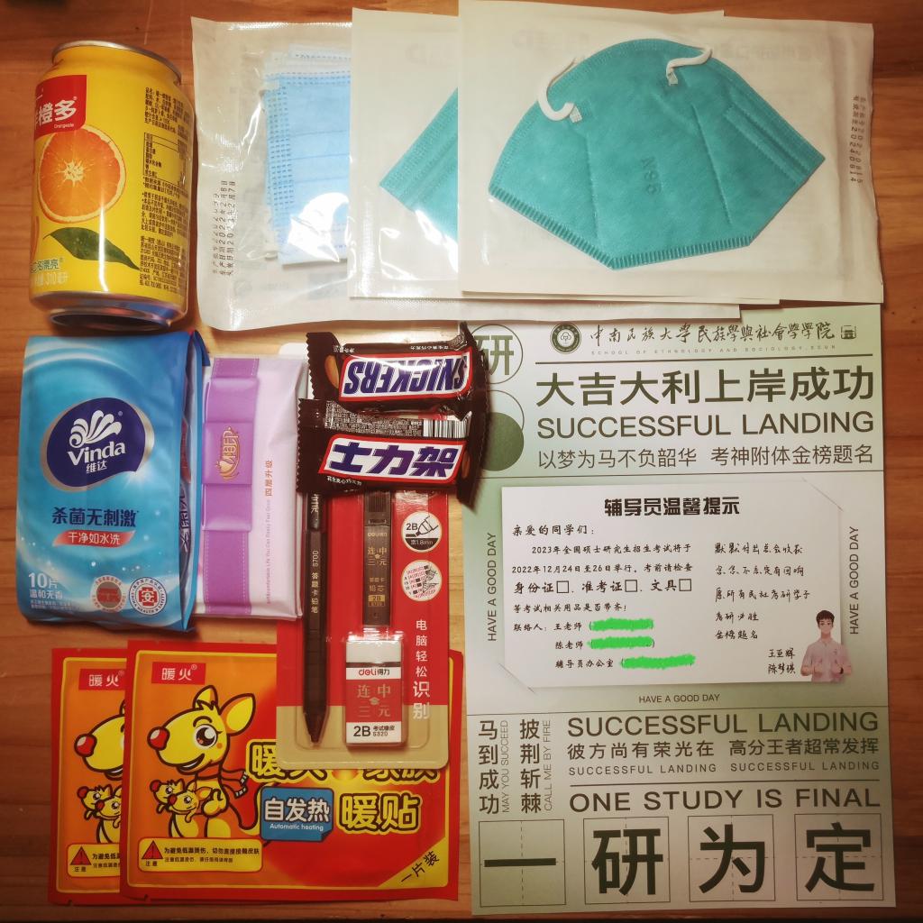 為了做好此次考研學生慰問工作,學院輔導員們在大禮包的準備方面花了不少心思,他們用心設計、精心準備、親自裝包,處處體現著愛心與溫暖。考研大禮包里面有N95口罩、消毒濕巾等防疫物資,有印著“金榜題名”的文具用品,有補充體力的能量棒,有寓意成功的橙汁飲料,還有防寒的暖寶寶。最別具匠心的是輔導員親自設計的考研加油卡片,橙粉綠黃藍玫紫七種顏色的卡片寓意成(橙)功上岸、高分(粉)錄(綠)取、飛黃騰達、美(玫)好人生、指(紫)定成功,卡片上還有輔導員的聯系方式和暖心寄語,為學院考研學子溫情護航。