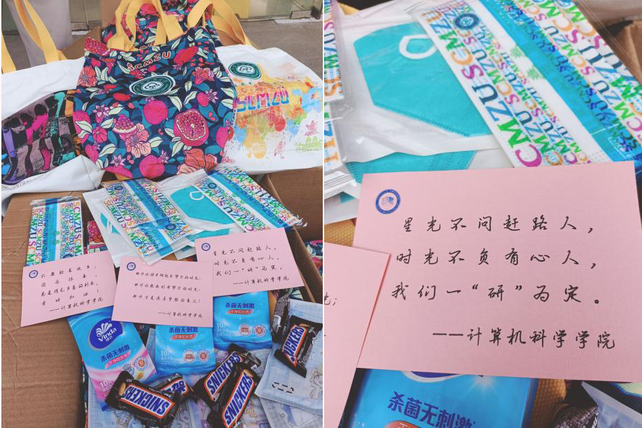 考研手提袋使用計科學院定制的帶有民大特色的包裝,上面印著“篤信好學,自然寬和”的校訓,裝有滿滿祝福和愛心物資。N95口罩、普通口罩、士力架、無菌濕紙巾以及寫滿祝福語的賀卡,無不表達著濃濃的心意?!靶枪獠粏栚s路人,時光不負有心人,我們一‘研’為定”“不要輕易放棄,因為驚喜總是悄無聲息地到來,考研加油”等鼓勵的話語,成為同學們冬日考研倒計時里最溫暖最特別的留戀。