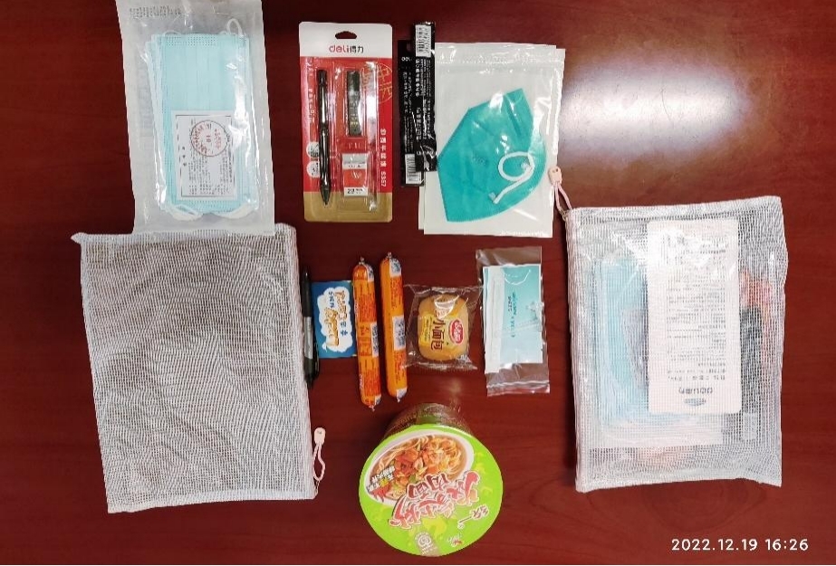 禮包內裝有一份抗原檢測試劑、一套考研專用文具包、2個N95口罩以及泡面、火腿腸、小面包等零食,還有一張輔導員親手寫的祝福刮刮卡。“金榜題名”“成功上岸”……一句句祝福語代表了學院對大家的殷切希望和美好祝福。陳卉丹老師一邊分發物資一邊悉心叮囑同學們多穿點、多喝水、調整好心理和身體狀態,以最好的精神面貌迎接考試。