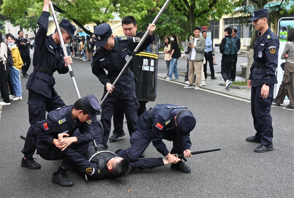 4月14日上午9時許,黨委保衛部聯合武漢市公安局在該校學生一二食堂間開展反恐防暴演練,在道路兩邊設置國家安全教育日主題展板。演練活動分為模擬警情、快速制服、防爆器材使用等環節。從“嫌疑人”出現到“嫌疑人”被制服,近乎真實的演習吸引了不少師生駐足觀看。演習結束后,武漢市公安局隊員就“反邪教警示教育”“國家安全法”等內容進行宣講,與在場師生進行面對面交流。