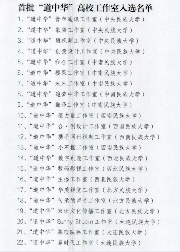 此次共有來自中央民族大學、中南民族大學、西南民族大學、西北民族大學、北方民族大學、大連民族大學等6所委屬高校的22個高校工作室入選。