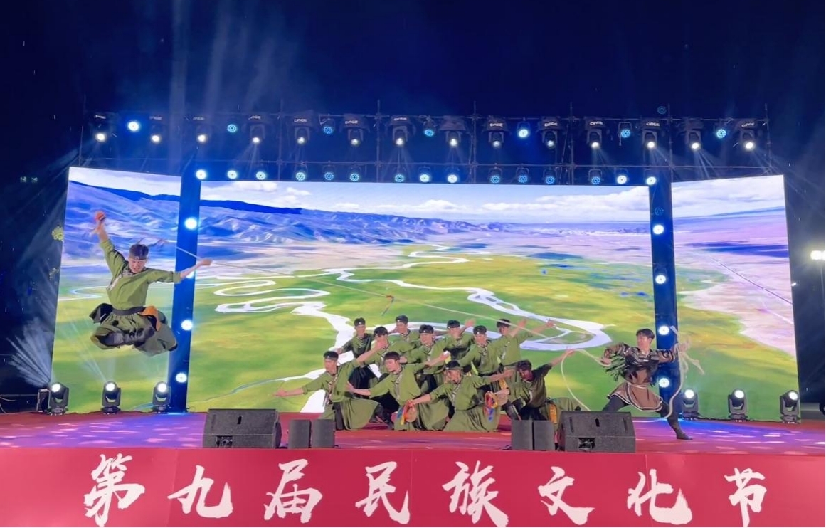 開幕式上,“石榴籽文藝輕騎兵”表演了舞蹈《馬背酒歌》。當(dāng)背景音樂(lè)響起,伴隨著蒙古漢子的低沉吟唱,舞蹈演員們身著草綠色的民族服飾,在悠揚(yáng)的馬頭琴聲中演繹著草原少年嬉戲玩鬧、把酒言歡的場(chǎng)景。隨后音樂(lè)陡然一轉(zhuǎn),踩著激情鏗鏘的音符,演員牽著長(zhǎng)韁繩疾步跳躍,仿佛騎駕一匹烈馬。跳躍、翻騰等極具挑戰(zhàn)性的動(dòng)作將“馬背上民族”的豪邁強(qiáng)健之風(fēng)展露無(wú)遺,引發(fā)觀眾陣陣驚呼,現(xiàn)場(chǎng)掌聲經(jīng)久不息。《馬背酒歌》是我校音樂(lè)舞蹈學(xué)院索南端智老師多年前原創(chuàng)的劇目,通過(guò)熱血灑脫的肢體律動(dòng),呈現(xiàn)蒙古族人民對(duì)草原的純真情懷,展現(xiàn)濃郁的草原風(fēng)情。