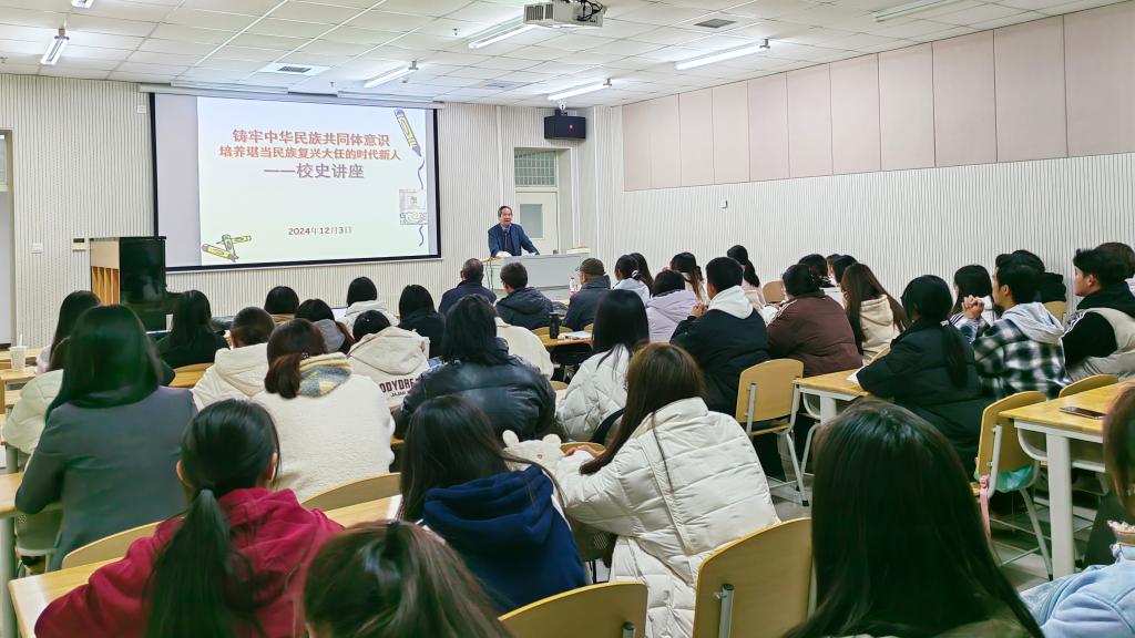 為全面落實學(xué)?!叭恕惫ぷ饕螅l(fā)揮檔案、校史資教育人、文化育人作用,12月3日晚,檔案館(校史館)聯(lián)合經(jīng)濟學(xué)院開展面向“成長守望計劃”學(xué)生、校史館講解隊學(xué)生、勤工助學(xué)學(xué)生的學(xué)習(xí)交流活動?;顒友垖W(xué)校70年校史編輯部主任李慶福老師作了題為《鑄牢中華民族共同體意識 培養(yǎng)堪當民族復(fù)興大任的時代新人》校史講座。