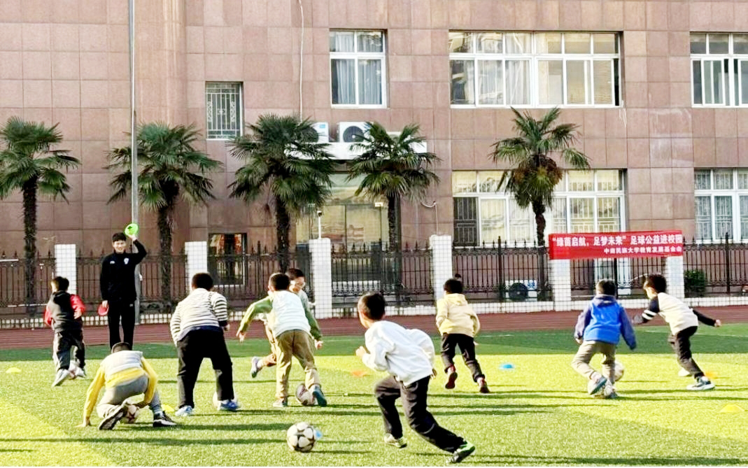 在小學生們迫不及待的熱情呼喚下,足球公益進校園活動正式拉開序幕。足球志愿教練們耐心地講解足球基本技能和比賽規則,認真示范動作細節和訓練流程:微微前傾,是帶跑動作;身體后仰,是射門動作;身體下蹲,是防守動作……“傳球時,腳內側要這樣輕輕推出去,要控制好方向和力道哦!”身材高大的教練半蹲著身子,雙手比劃著,仔細糾正孩子們的動作,話語溫和而有力。他們的熱情鼓勵和細心指導讓孩子們很快就投入到學習狀態中來。