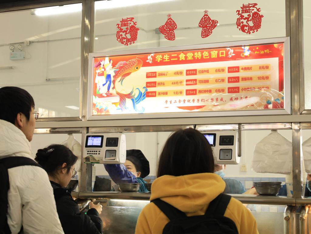 除了美食之外,我校各大自營食堂的布置也格外用心。食堂外懸掛著寫著“吃得飽飽,上岸沒煩惱”、“山河遼闊,人間煙火,上岸路上,我們?nèi)拖喟椤币约啊吧礁呗愤h(yuǎn),食光暖暖,能量滿倉,桂冠揚(yáng)帆”的勵(lì)志橫幅?!吧习丁贝翱谏线€貼著由學(xué)生親手制作的剪紙飾品,這些剪紙不僅造型精美,而且寓意深刻,與“上岸”窗口的特色菜品相得益彰,共同營造出一個(gè)積極向上、溫暖人心的用餐氛圍。