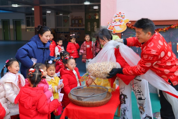 “砰”,一聲爆米花響,孩子們樂(lè)開(kāi)了花,親眼目睹了玉米粒在高溫與壓力的奇妙作用下瞬間化作蓬松的“米花云團(tuán)”。接著,各班幼兒陸續(xù)體驗(yàn)了“木版年畫(huà)”“打糍粑”等活動(dòng)。他們?cè)诶蠋煹闹笇?dǎo)下制作出一張張精美的年畫(huà),了解了傳統(tǒng)美食糍粑的制作過(guò)程。整個(gè)活動(dòng)都洋溢著快樂(lè)的節(jié)日氛圍,一張張稚嫩的小臉上綻放著燦爛的笑容,歡聲笑語(yǔ)回蕩在幼兒園的每個(gè)角落。