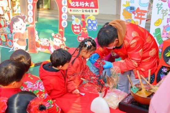此次活動(dòng)包括“尋寶游戲”和“民俗體驗(yàn)”兩個(gè)部分。“尋寶游戲”中,各班幼兒在老師的陪伴下尋找與新年相關(guān)的“密碼寶貝”,紅包、福字卡、新年賀卡、靈蛇卡等,用來(lái)?yè)Q取“民俗體驗(yàn)”入場(chǎng)券。“民俗體驗(yàn)”區(qū)創(chuàng)意設(shè)計(jì)了“打糍粑”“木版年畫(huà)”“糖畫(huà)”“吹糖人”“爆米花”等各類(lèi)傳統(tǒng)趣味項(xiàng)目。