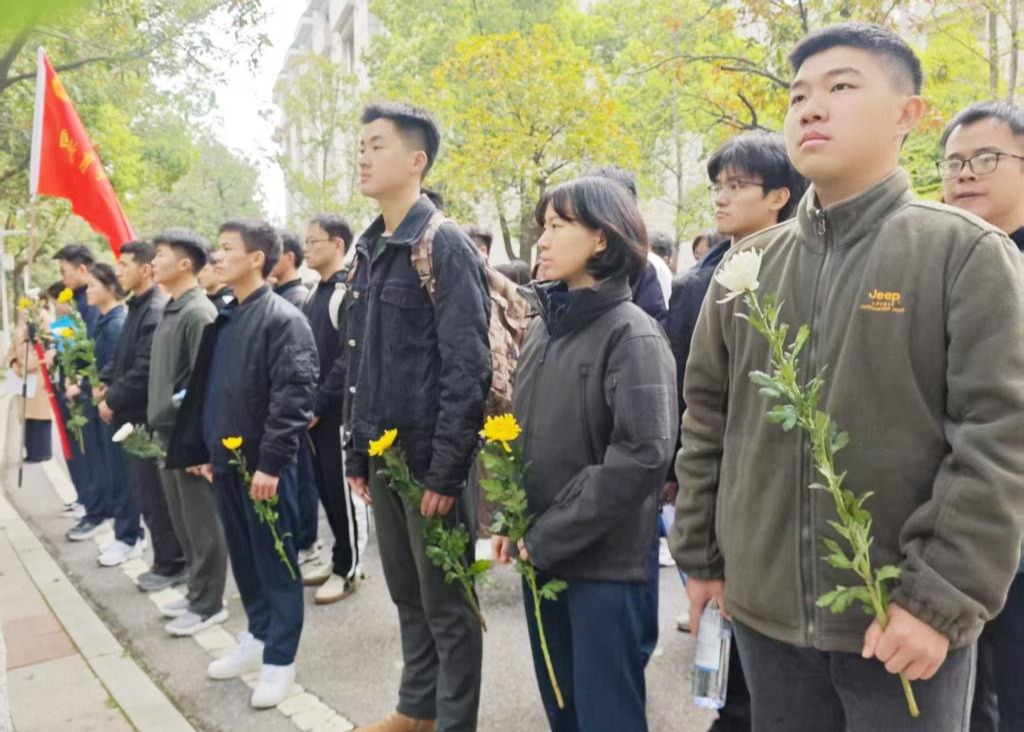“全體脫帽,默哀!”隨著指令下達,同學們集體垂首,靜默一分鐘。默哀禮畢,同學們依次緩步上前,將手中的菊花輕放在吳澤霖老先生雕像前。數學與統計學學院2023級本科生張韻婷感慨地說:“這是我第一次送花,看著面前層層疊疊的花,內心深受感動。是前輩們的辛勤付出,才有如今的美好生活,我會更加珍惜這來之不易的幸福?!?/p>