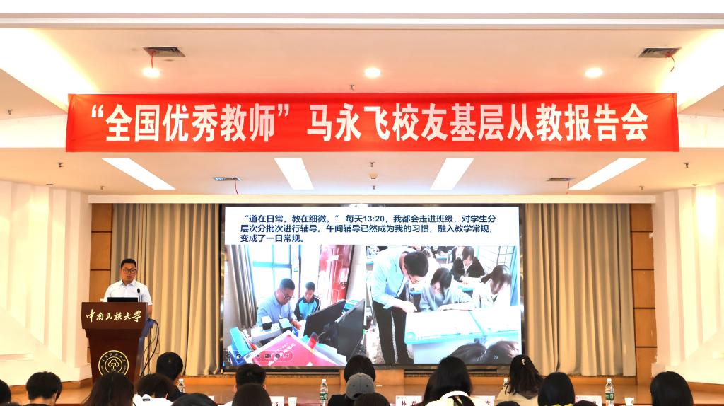 為激勵青年學子堅定理想信念、厚植教育情懷,4月12日晚,我校教育學院2015屆優秀校友、2024年“全國優秀教師”榮譽獲得者馬永飛基層從教主題報告會在學術交流中心舉行。校黨委常委、總會計師包莉娜,教育學院200余名師生共同參加,報告會由教育學院黨委書記林晉主持。