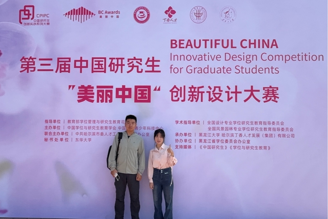 這是我校研究生院第一次組織研究生團隊參加該項賽事,美術學院學子積極參賽并載譽歸來。“青設山河”團隊蘇巧玉、張弘毅同學前往哈爾濱現場參加總決賽并榮獲二等獎。蘇巧玉表示,雖是首次參加該設計大賽卻收獲頗豐。在國賽答辯現場,評委老師提出的建議和意見十分精準,不僅幫他們團隊清晰看到了自己作品在專業領域有待提升,也讓她清晰地意識到了自己與頂尖水平的差距。這份差距激發了她繼續沉下心鉆研技術、打磨好每一行代碼的決心和動力。今后,他們將帶著對專業的敬畏向優秀者看齊,努力在專業創新實踐這條賽道上走得更穩、更遠。
