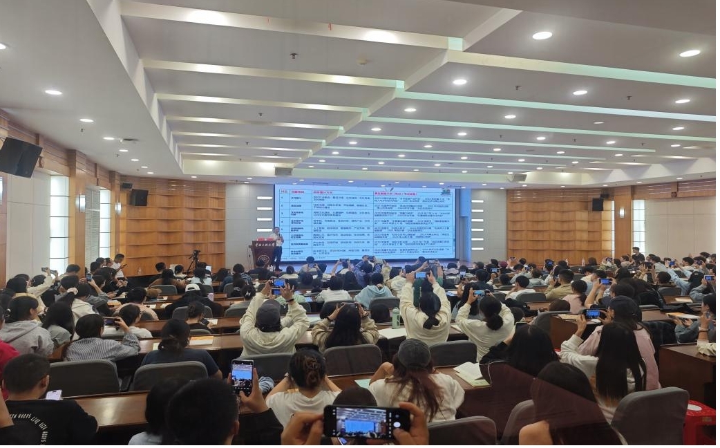 講座現(xiàn)場座無虛席,氣氛熱烈。講座開始前,覃瑞向夏曉華校友頒發(fā)就業(yè)教育指導(dǎo)“客座教授”聘書。隨后,夏曉華結(jié)合個人奮斗經(jīng)歷與當(dāng)前就業(yè)形勢,系統(tǒng)分析了新時代公務(wù)員職業(yè)的發(fā)展前景,并針對國考、省考、事業(yè)單位招聘以及“三支一扶”、西部計劃等不同招錄渠道,從考試難度、時間節(jié)點、備考策略等多個維度進(jìn)行了專業(yè)解讀。