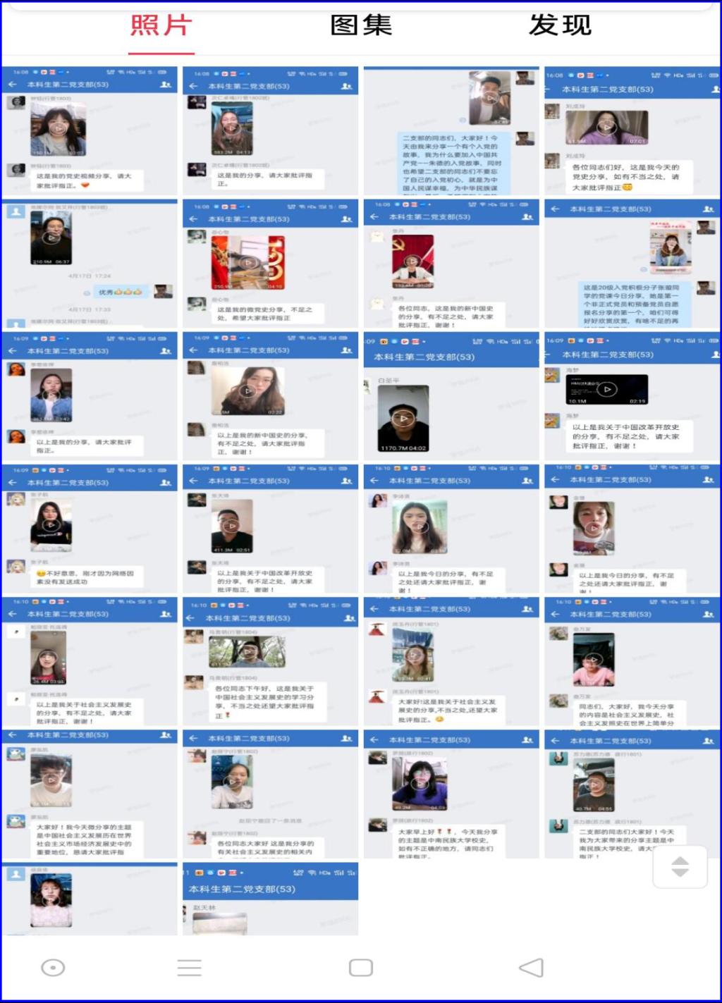 自4月12日起,黨支部成員每日輪流擔任“分享員”,在黨支部企業微信群和積極分子企業微信群內以微視頻的形式分享“四史”學習心得,以及民大校史、反電詐安全教育知識、心理健康教育和家鄉正能量等主題的內容,形式活潑,內涵豐富。