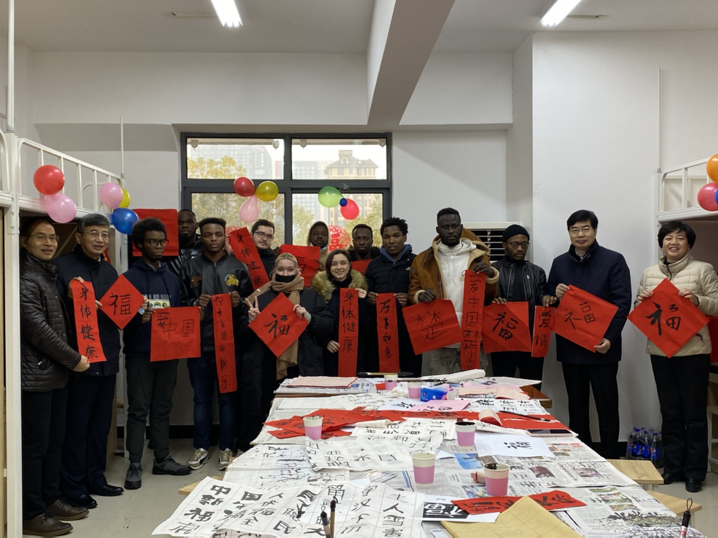 1月30日,在校留學生參加了學校組織的新春慰問活動。校黨委書記邊境,校長李金林,校黨委常委、組織部部長蔡瓊,以及學校各部門負責老師與同學們親切交流,并致以節日問候和新春祝福。活動中,大家還體驗了寫春聯、寫福字。