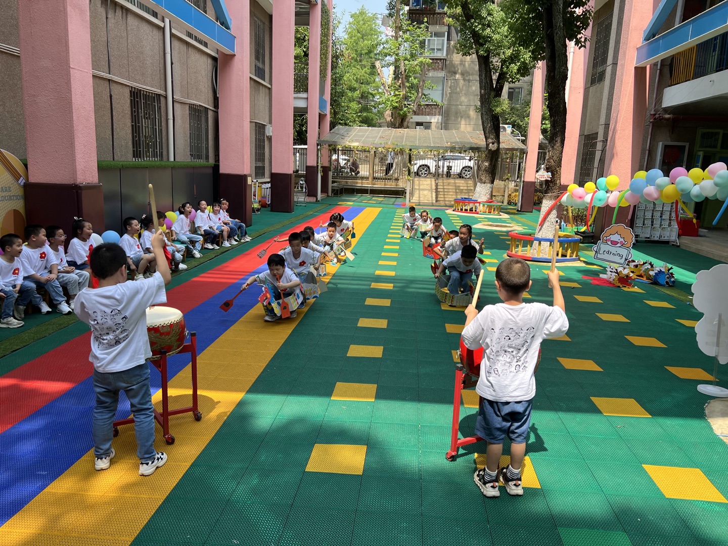 “咚咚,咚咚咚……”,尋著歡快有節(jié)奏的鼓聲,大一班的小朋友正在操場(chǎng)上舉行一場(chǎng)別開(kāi)生面的旱地賽龍舟比賽。比賽現(xiàn)場(chǎng),孩子們分成兩隊(duì),每個(gè)人“坐”著自己親手制作的龍船,手持“滑行槳”,裁判員一聲令下,各隊(duì)選手在各自的賽道上展開(kāi)了激烈競(jìng)爭(zhēng)。隊(duì)與隊(duì)之間是競(jìng)爭(zhēng),隊(duì)里組員之間是默契有序的合作,大家爭(zhēng)先恐后,鼓點(diǎn)敲得愈來(lái)愈快,似乎變成了孩子們急促的腳步,跳動(dòng)的心臟。站在兩旁的觀眾,一聲聲“加油”聲,夾雜著焦急的情緒都快喊出了嗓子眼,一條條細(xì)細(xì)的胳膊齊刷刷地自右向左往前揮動(dòng),為隊(duì)伍輸送著自己的力量……