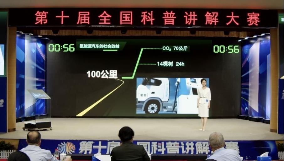 比賽中,陳亞凌老師立足新能源,從國家綠色發(fā)展大戰(zhàn)略出發(fā),介紹氫能源汽車的發(fā)展歷史和運(yùn)作原理,生動講解了氫燃料電池的化學(xué)反應(yīng),并詳細(xì)解釋了氫能源汽車的熱點問題,充分展現(xiàn)氫能源汽車的未來發(fā)展前景。其講解自然流暢,科學(xué)知識突出,收獲了現(xiàn)場觀眾的陣陣掌聲,得到了評委們的一致肯定。
