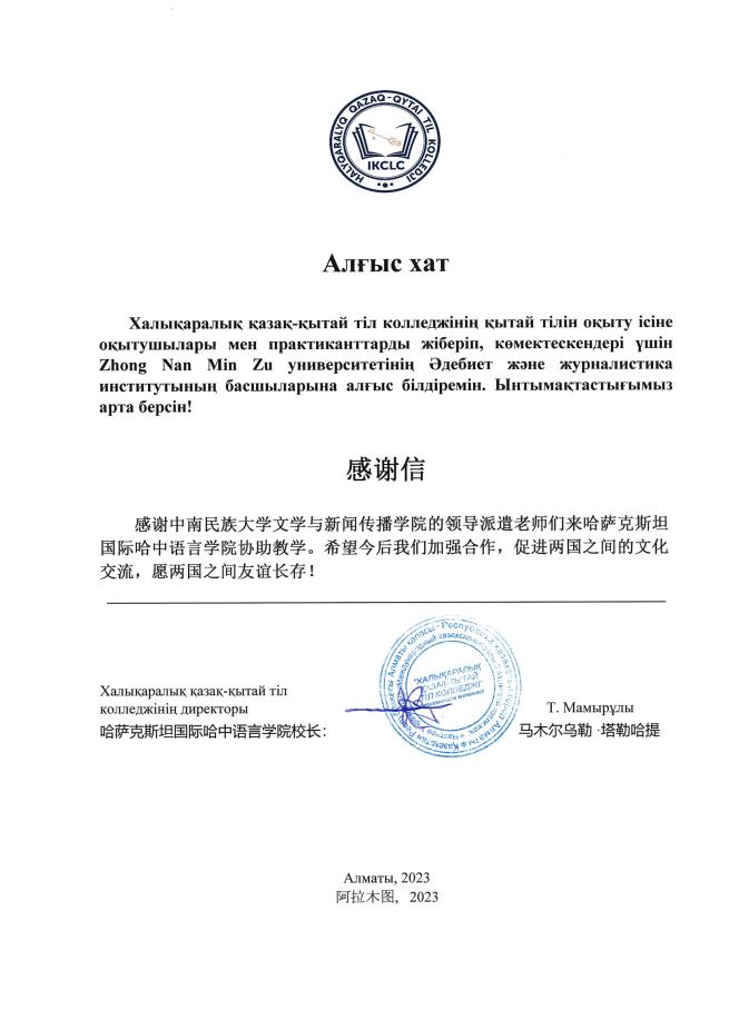 國(guó)際哈中語(yǔ)言學(xué)院是哈薩克斯坦國(guó)家教育部批準(zhǔn)的、以培養(yǎng)漢語(yǔ)專長(zhǎng)人才為特色的職業(yè)學(xué)院,自2019年起,成為文傳學(xué)院首個(gè)海外實(shí)習(xí)基地,這也是國(guó)家民委直屬院校中第一個(gè)海外實(shí)習(xí)基地。四年來(lái),學(xué)院不斷派出師生開展教學(xué)與實(shí)習(xí)工作,并取得了明顯成效。