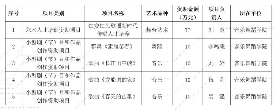 3月14日,國家藝術基金管理中心公布了國家藝術基金2024年資助項目立項名單。我校喜獲5項國家藝術基金項目,其中藝術人才培訓資助項目1項,小型?。ü潱┠亢妥髌穭撟髻Y助項目4項,在委屬高校和湖北省內高校中名列前茅,創歷史最好成績。