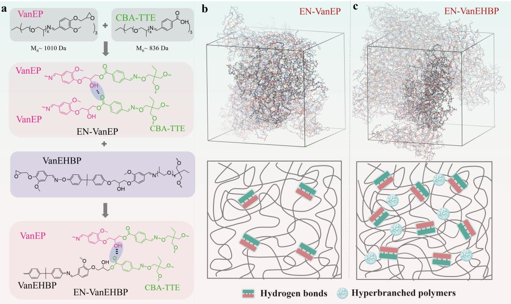 超分子環氧樹脂的內部分子間相互作用(a)和超分子網絡結構的分子動力學模擬(b- c)。 學院供圖