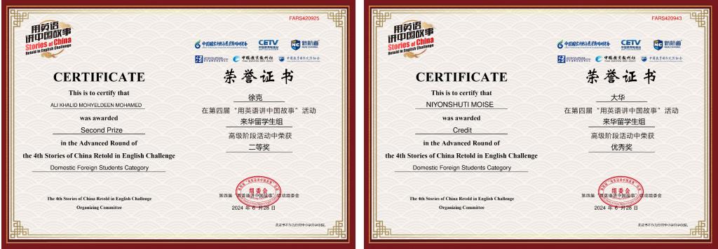 6月28日,在教育部中外語言交流合作中心、中國國家創新與發展戰略研究會、中國教育電視臺、中國教育報社等單位聯合舉辦的第四屆“用英語講中國故事”比賽中,我校來自蘇丹的留學生ALI KHALID MOHYELDEEN MOHAMED(中文名徐克)、來自盧旺達的留學生NIYONSHUTI MOISE(中文名大華),在李素珺、郝健老師指導下,用中文講述他們經歷的中國故事,展示中華才藝,分別獲得來華留學生組高級階段(大洲級別選拔)的二等獎和優秀獎。