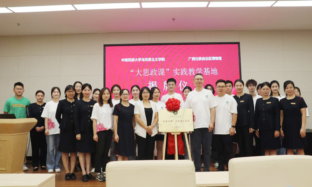 7月2日上午,馬克思主義學院與廣西壯族自治區博物館(以下簡稱廣西博物館)共建“大思政課”實踐教育基地揭牌儀式在廣西博物館報告廳舉行。廣西博物館黨委副書記唐劍玲,我校教務處副處長陳曉希,馬克思主義學院副院長滕帥、學工辦主任金瑤等師生代表30余人參加。滕帥向廣西博物館社會教育部副主任蕭瀟、館員羅麗詩頒發中南民族大學“大思政課”社會實踐指導教師聘書,陳曉希向2人頒發國家語言文字推廣基地(中南民族大學)語言文字研究導師聘書。