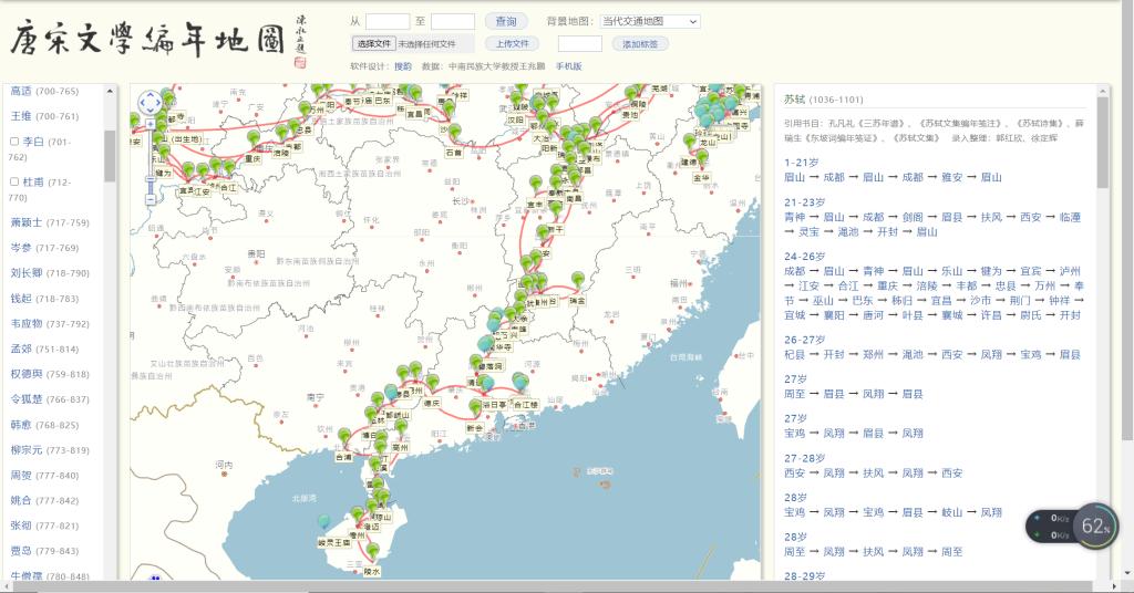 《唐宋文學編年地圖》軟件截圖。 實驗教學與實驗室管理中心供圖