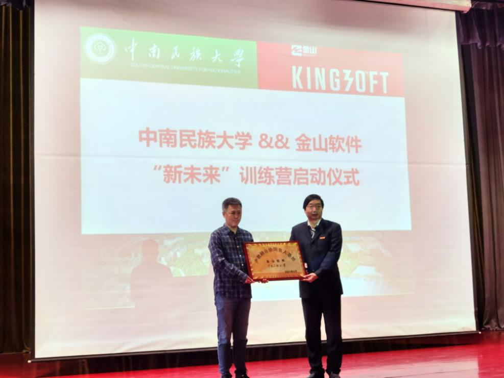 姚冬、黃迎新共同為“中南民族大學-金山軟件產教融合協同育人基地”揭牌,宣布“新未來”訓練營開營。