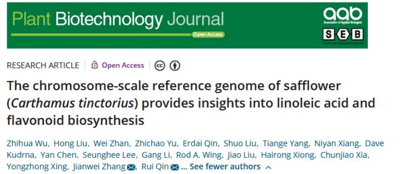 近日,我校生科學院覃瑞教授團隊聯合華中農業大學作物遺傳改良國家重點實驗室張建偉與邢永忠教授課題組在Plant Biotechnology Journal發表了“The chromosome-scale reference genome of safflower (Carthamus tinctorius) provides insights into linoleic acid and flavonoid biosynthesis”(紅花染色體水平的參考基因組解析其亞油酸和類黃酮的生物合成)研究論文。