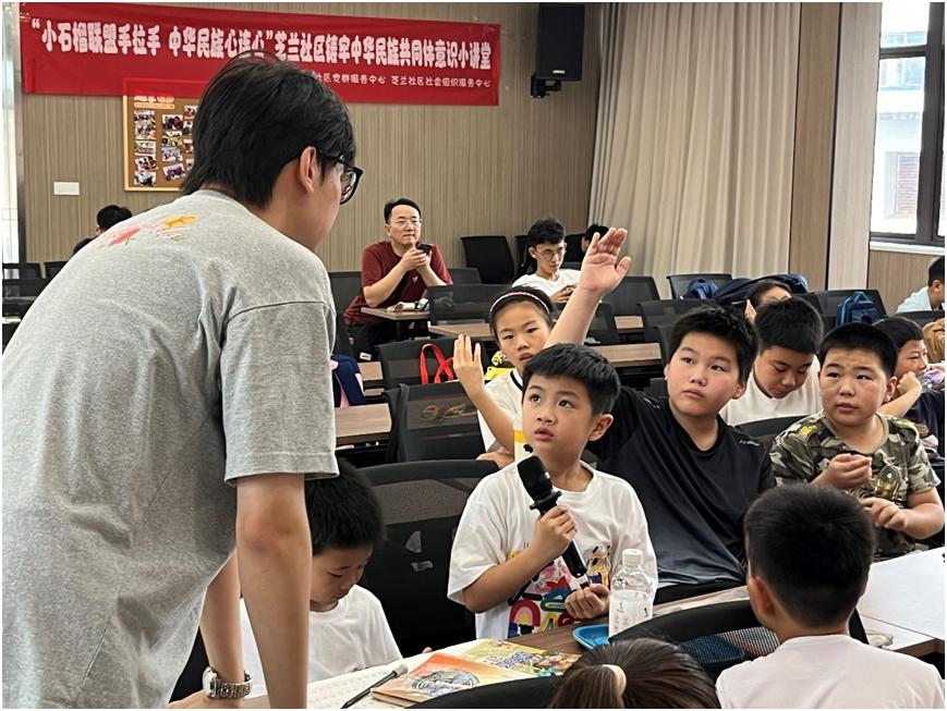 7月26日至31日,在芝蘭社區兒童之家開展的宣講活動。在活動現場,宣講團成員通過生動的故事和有趣的互動,深入淺出地介紹了鑄牢中華民族共同體意識的重要性。小學生們在歡快的氛圍中,認真聽講,積極舉手發言,用稚嫩的聲音表達對中華民族大團結的理解和向往。宣講團參觀了北侖區鑄牢中華民族共同體意識實踐基地,在芝蘭社區的“鄰里會客廳”感受溫馨的“家庭化”“客廳式”服務模式,在和豐社區感受了黨建引領下的多元化治理模式和未來社區建設的創新活力。
