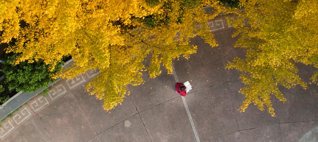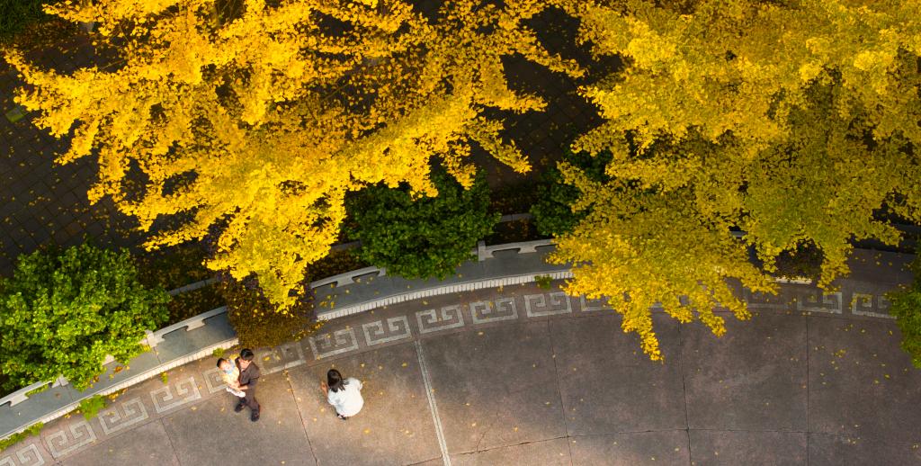 這組《秋日三疊》,是我們為秋天提交的一份層次豐富的答卷。首章,是流動的詩。高空俯瞰,紅黃交織的樹冠為街道披上秋衣,兩名騎行者穿梭于暖柔的光影中,仿佛律動的音符,奏響了季節的交響序曲。次章,是靜默的思。銀杏樹下,金黃浸染天地,少年獨自沉浸在書頁里。此刻,飄落的葉與翻動的書頁私語,構成了一個內外豐盈的寧靜宇宙。終章,是溫暖的光。同樣的金杏覆頂,成為一家人的閑適背景。懷抱的幼童、蹲下的身影,在秋景的包裹中,定格了比陽光更暖的親情瞬間。