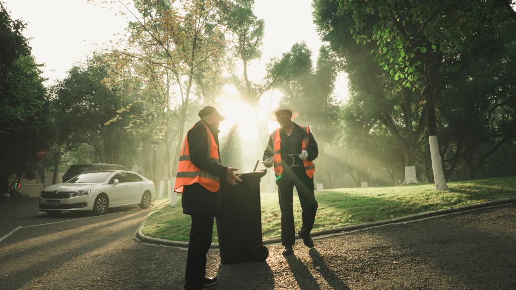 當第一縷晨光穿透薄霧,為秋日花園鍍上溫暖的鎏金,這幅名為《秋日晨光的守護者》的畫卷便悄然展開。兩位環衛工人的身影,是晨光中最動人的筆觸。他們揮動掃帚,掃起的不僅是落葉,更是冬日寧靜的前奏。那沙沙聲響,仿佛是季節與季節之間的溫柔交代。