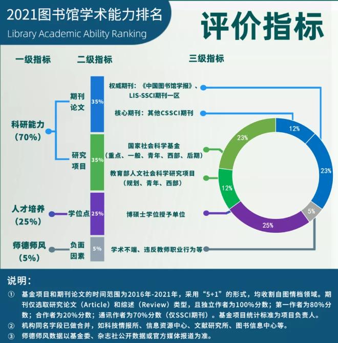 圖書館學術能力排名是首個針對圖書館學術競爭力水平進行綜合評價的指數。評價體系涵蓋科研能力、人才培養和師德師風在內的3大類10個細分數據類型,使用的均為最能體現圖書館學術水準的量化元指標,并采取期刊+作者綜合權重的方式,旨在給出一個具有對標基準、多層次、分權重、符合業界特色的綜合評議依據。