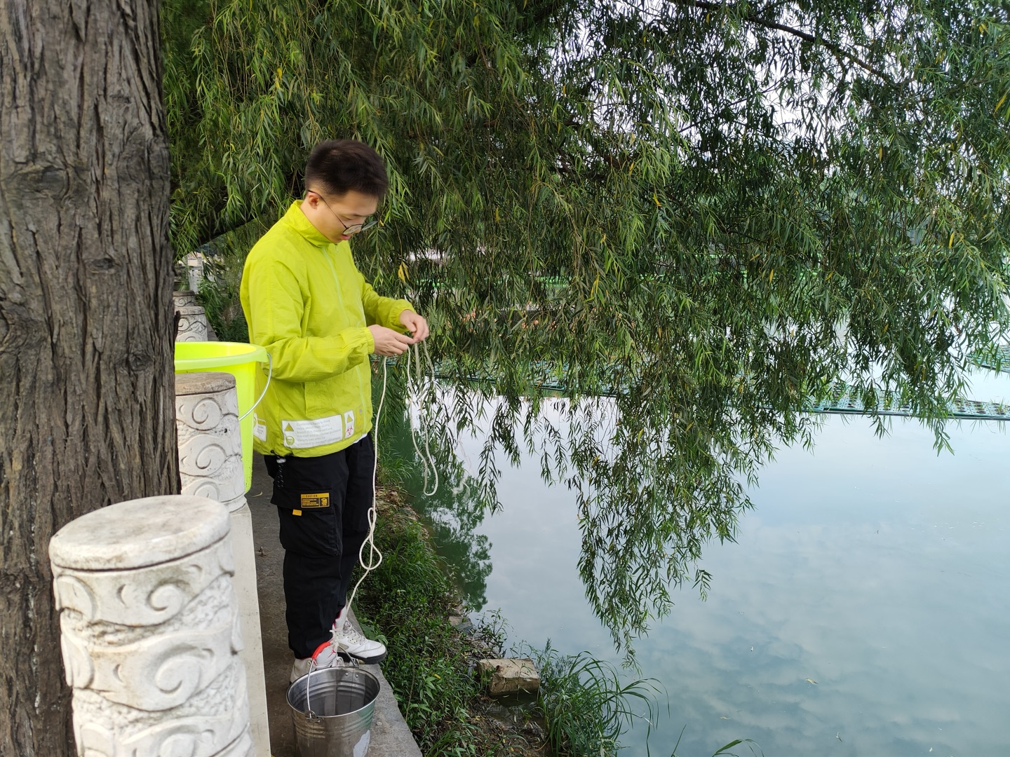 張峰瑞在南湖邊準備采樣。