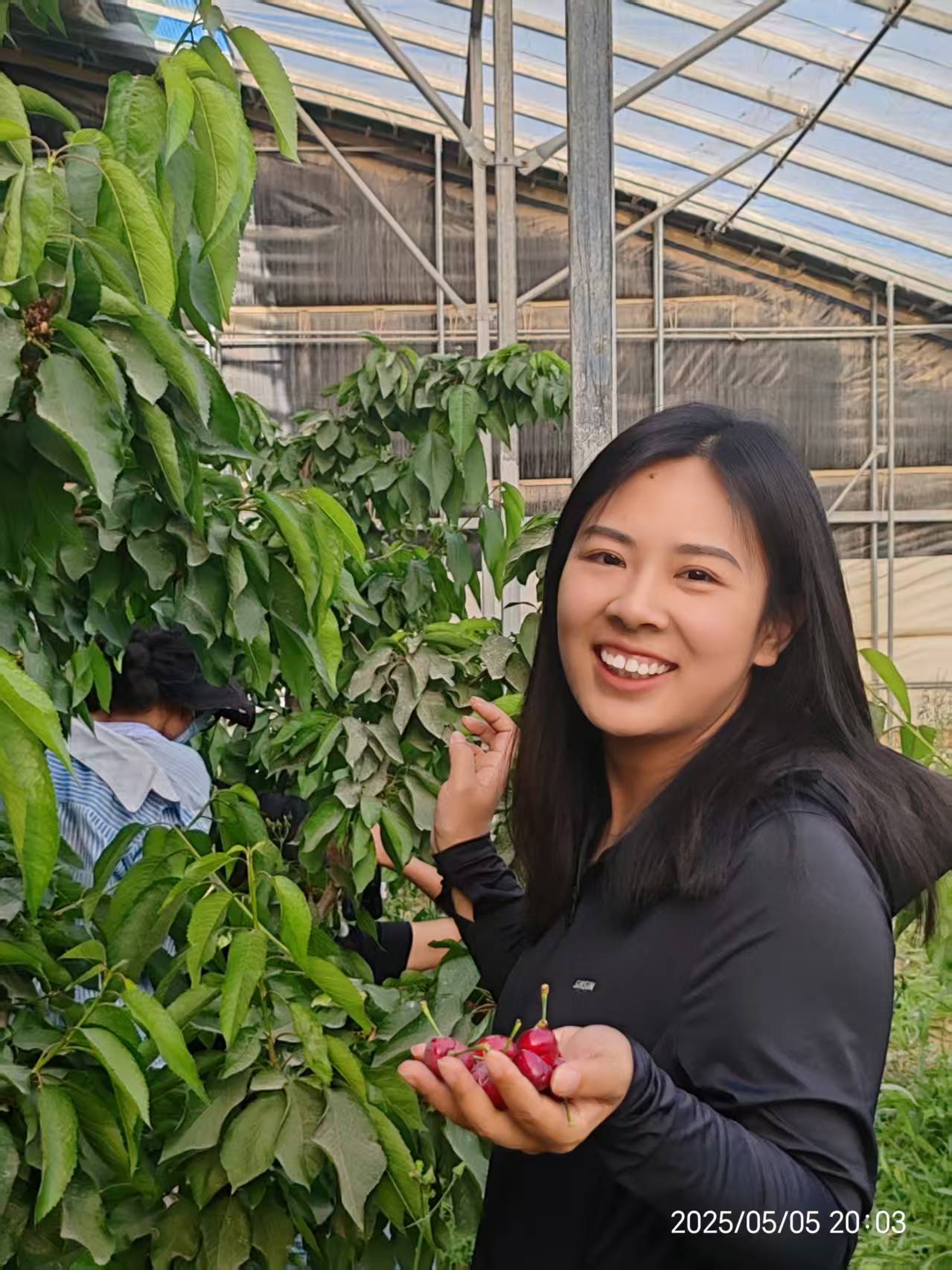 向莉蓉在庫木庫薩爾鄉8村大棚櫻桃園幫助農戶宣傳櫻桃。