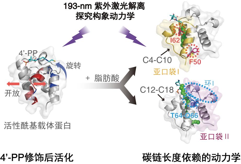該研究采用非變性質譜(nMS)與193-nm紫外光解離(UVPD)聯用技術,對酰基載體蛋白(ACP)的活化過程及與不同鏈長脂肪酰基的分子互作機制提出新見解。該研究通過nMS與193-nm UVPD聯用技術,成功實現了對酰基化ACP不穩定中間體的選擇性捕獲及其構象動力學特征的高靈敏度表征。研究發現,酰基鏈首先插入ACP的疏水性亞口袋I中,直到當其鏈長超過10個碳原子(大于C10),過長的疏水碳鏈會發生彎曲并進入亞口袋II。Phe50和Ile62兩個關鍵氨基酸位點在調節ACP疏水口袋尺寸方面起著關鍵性作用,而Loop I及Thr64-Gln66區域對于穩定長酰基鏈(C12-C18)至關重要。這項研究不僅為從分子層面上提出了ACP對酰基鏈長度調控機制的新見解,也為合理改造ACP結構以提高目標脂肪酸(如中鏈脂肪酸,C8-C12)的生物合成效率提供了理論指導。