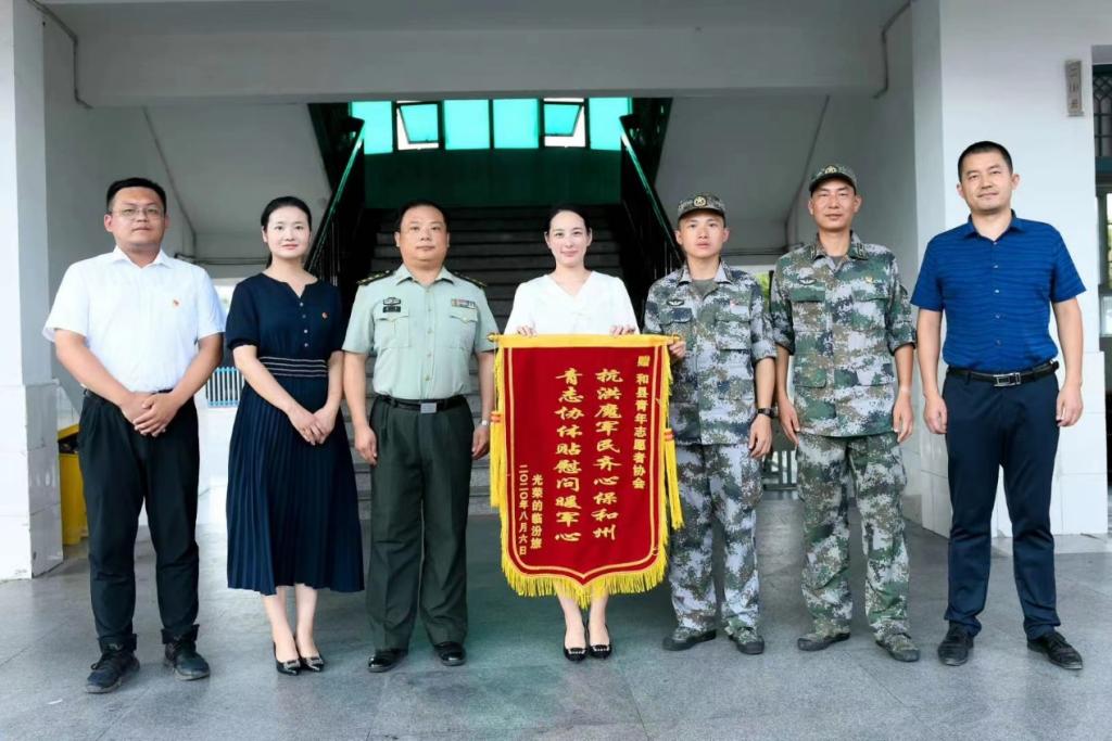 抗洪官兵為青年志愿者協會贈送錦旗(左一)